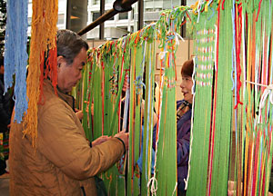 高さ2m、幅、奥行き6mの鉄枠にまずグリーンの縦糸をかけ、それに参加者が思い思いの色の横糸を編んで色鮮やかな巨大な布を織ろうと言うもの。「一本の糸を折り重ねていくことにより面(社会)が生まれます」と日比野さんは語っていました。一本一本の糸たちが折り重ねられ、大きな布となることで、移植者や障害者が一般の方達と共生できる社会の実現をめざすことこのキャンペーンの意義です。またグリーンは移植医療のシンボルで、ドナーとレシピエントのいのちの繋がりも表現しています。