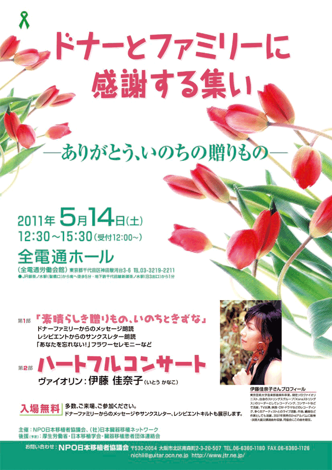 ドナーとファミリーに感謝する集い ―ありがとう、いのちの贈りものー 日時:2011年5月14日(土)12:30〜15:30(開場12時)